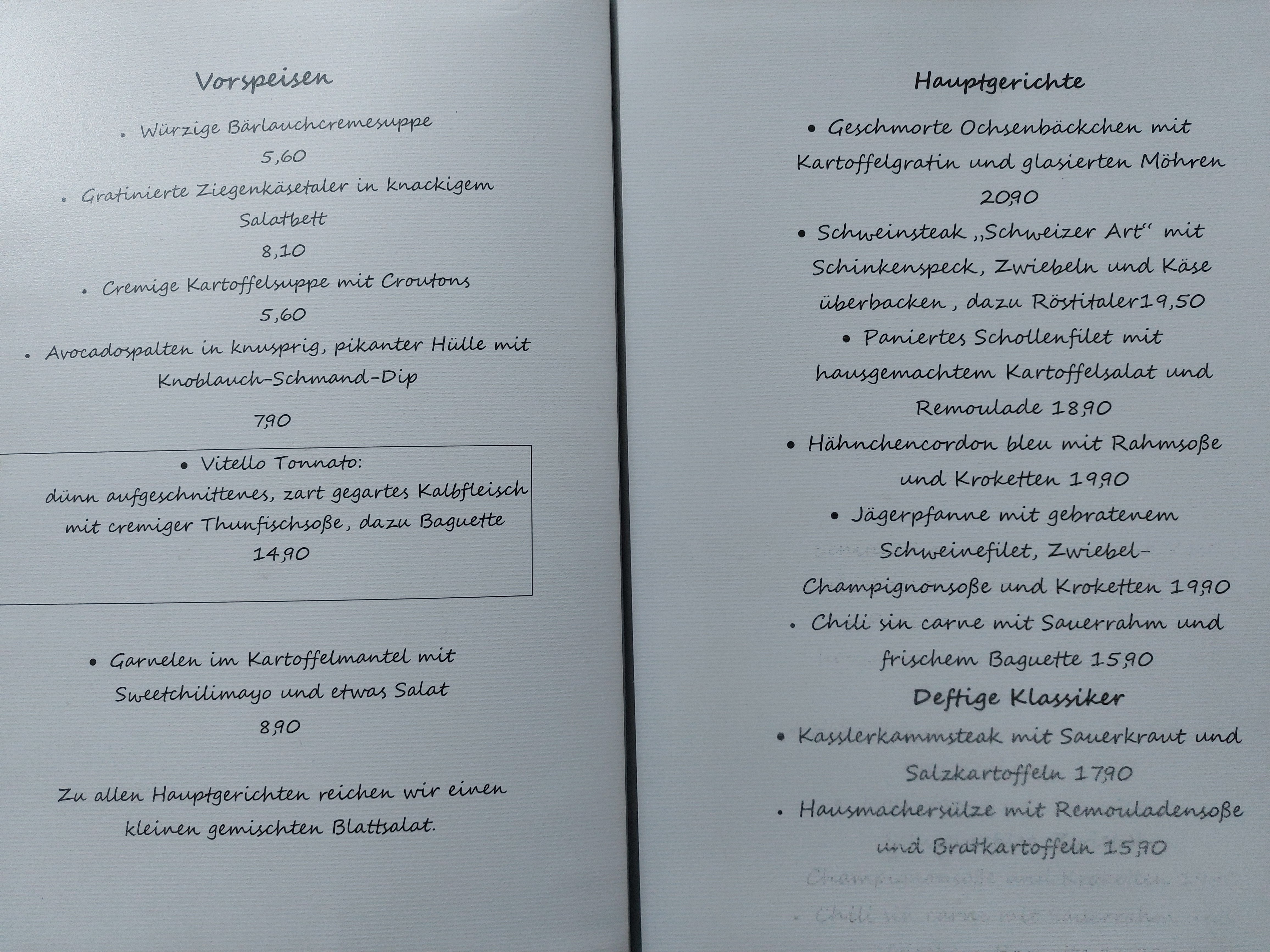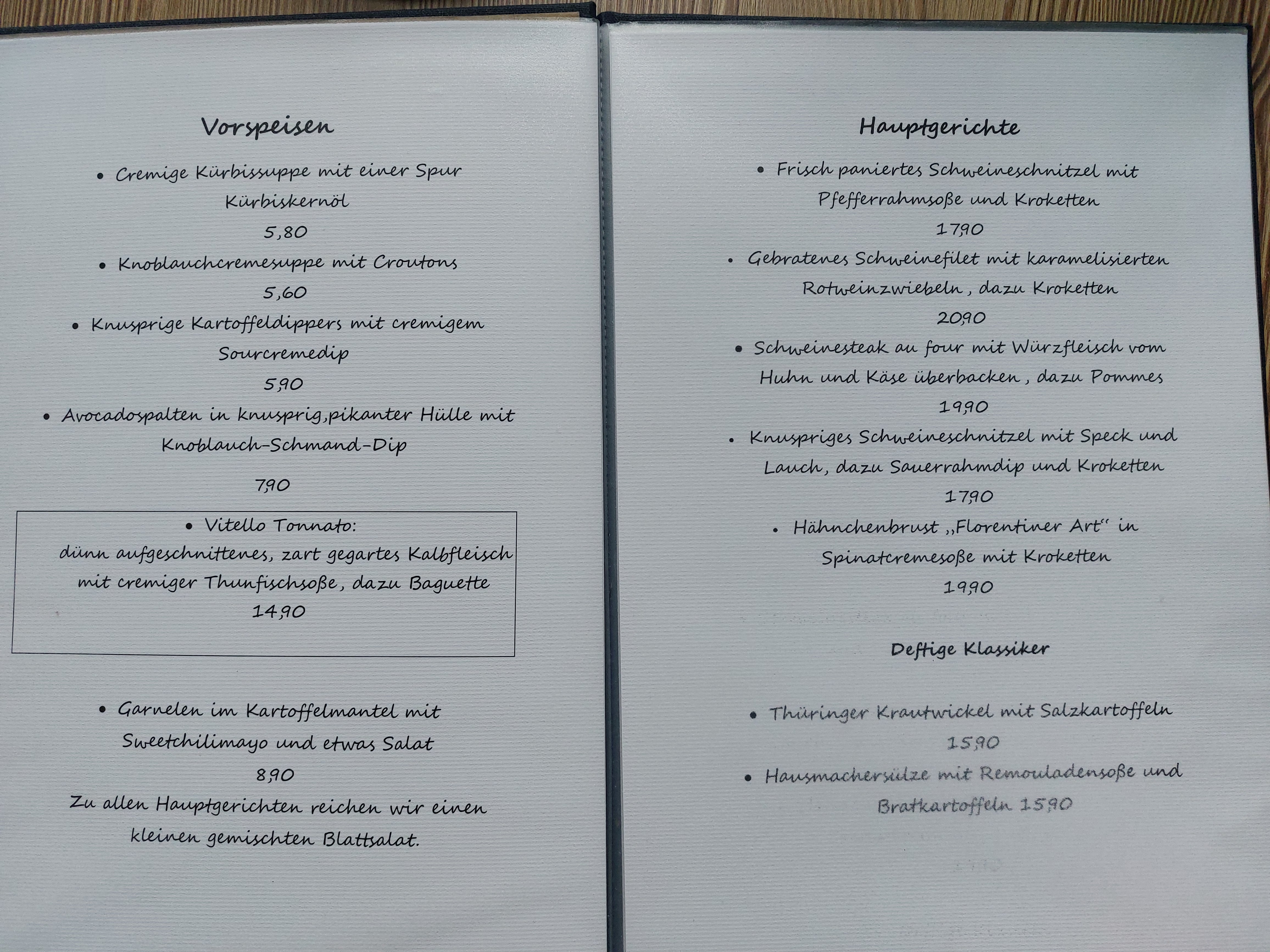 Unsere Speisekarte umfasst eine kleinere Auswahl an Speisen, wodurch es uns möglich ist alle Speisen frisch zu zubereiten. In regelmäßigen Abständen wird unsere Speisekarte aktualisiert, sodass wir unseren Gästen immer wieder auf ein Neues unsere kulinarische Bandbreite präsentieren und auch saisonale Produkte einfließen lassen können.